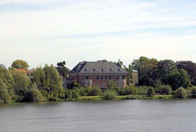 The Villa Kampffmeyer stands on the shore of Tiefer See lake, featuring three graces sculptures and a Mercury figure above its entrance portal.