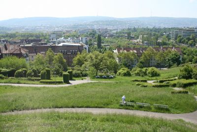 A ten-meter-high observation hill called Bastion Leibfried provides views of Stuttgart city center from its platform among the garden grounds.