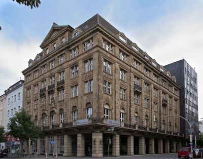 The ground floor once housed the Elite-Café Löwenhof, which served as one of the largest concert cafes in West Germany during its peak. This venue was a major gathering place for music and entertainment in the city.
