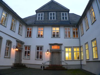 The two-story baroque palace features a light-plastered facade with a stone-encased arched entrance leading to a rectangular inner courtyard.