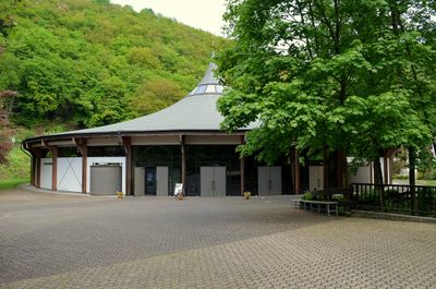The circular church building extends 50 meters in diameter with a tent-shaped design featuring 32 wooden columns that rise to 23.5 meters at the center point.
