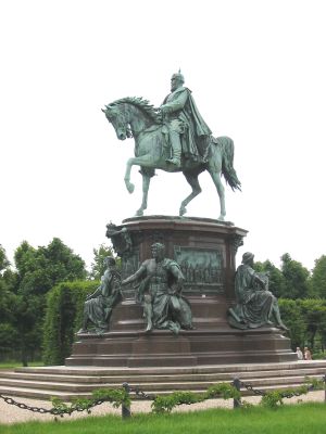 The Reiterdenkmal Friedrich Franz II. is a bronze statue of a grand duke on horseback standing atop a marble pedestal surrounded by four allegorical figures representing strength, justice, wisdom, and faith. The pedestal is decorated with reliefs and inscriptions that document important events from the ruler's life.