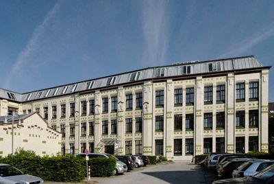 Between 1904 and 1906, architects Heinrich Salzmann and Ganzlin created this structure as headquarters for Jagenberg Works, which operated paper manufacturing until 1984.