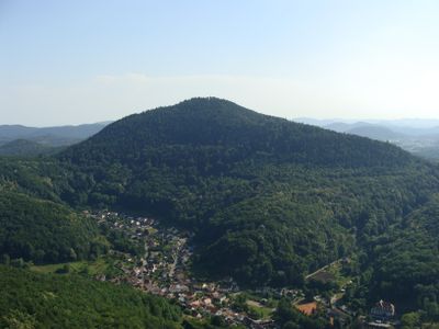 The mountain stands approximately two kilometers south of Annweiler, with marked trails leading to the summit and connecting to the broader regional path network.