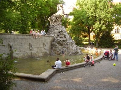 The central area of Rudesheimer Platz contains expansive green spaces, old trees, flower beds, and the Siegfried fountain with sculptures from 1911.