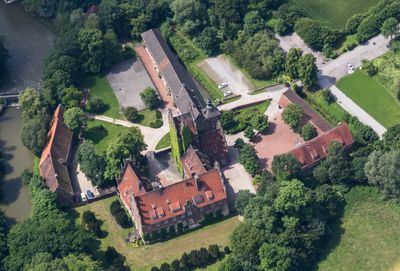 The Castle of Heessen features a three-winged red brick manor house with neo-Gothic stepped gables and a 32-meter-high main tower.