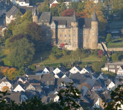 Herborn Castle is a stone fortress on elevated ground above the town, featuring multiple towers and architectural elements spanning different construction periods. The building has three wings arranged around an inner courtyard, blending Gothic and Renaissance details.