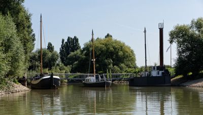 The three ships forming the bridge structure represent different types of Dutch vessels from the early 20th century: a Rhine clipper, an eel catcher, and a freight sailor.