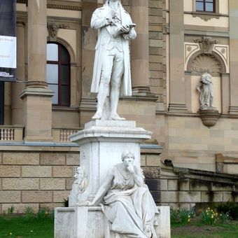 The statue honors Friedrich Schiller, who shaped German literature through his works exploring themes of freedom, morality, and human nature alongside Johann Wolfgang von Goethe.