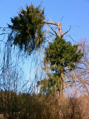 The Schlangenfichte features extended hanging branches with sparse needles, standing among three snake spruces in close proximity to each other.