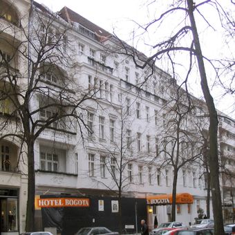 The property maintains its dual function as a hotel and revenue house, situated near public transportation and commercial establishments in central Berlin.