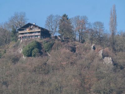 The Schweizerhaus stands on a rock plateau 130 meters above the Rhine River, offering views of Assmannshausen and Binger Loch through its location.