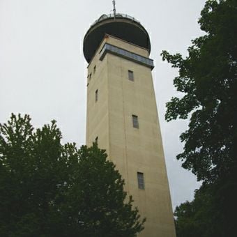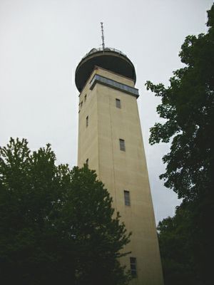 The Deutsche Telekom telecommunications tower and observation platform were constructed on the mountain summit during the expansion of German communications infrastructure.