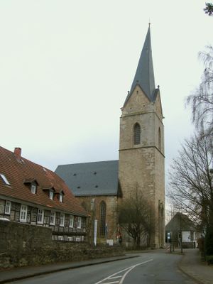 St. Nikolai is a Gothic church in Korbach with a distinctive western tower built in 1359 that dominates the skyline. The interior features a wide central space supported by rounded columns covered with ribbed vaulting throughout.