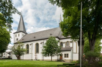 St. Pankratius features a three-nave hall design with rounded arch windows, buttresses supporting vaulted ceilings, and a stone bell tower dating from 1150.