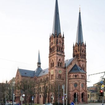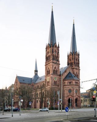 Construction of the church began in 1894 after architect Josef Durm modified the initial Gothic plans to emphasize Romanesque elements, leading to its consecration in 1899.