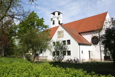 The congregation began in 1926 with a temporary wooden church before the stone building was constructed in 1932 following architect Hans Döllgast's winning design. The bell tower followed decades later in the late 1950s, completing the church's present form.