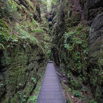 Schwedenlöcher is a narrow rock gorge with natural sandstone formations and constructed stone steps winding through different levels of the canyon. Concrete bridges connect various sections and guide visitors safely over deep gaps and steep passages.