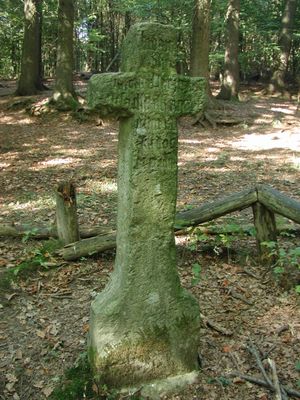 The stone cross stands near the former Cologne-Dortmund military road, featuring weathered inscriptions carved into its robust surface.