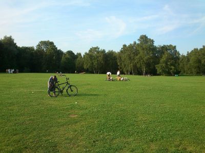 Tremoniapark spans 13 hectares, featuring vast grassy areas, walking paths, basketball courts, and scattered patches of natural woodland throughout the space.