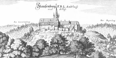 Stauffenburg is a castle ruin perched on a hillside in the Harz Mountains near Goslar, composed of stone walls and medieval foundations. The remains reveal the original layout of buildings and the multiple defensive levels of the fortress.