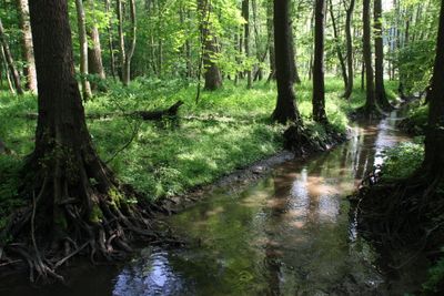 The forest surrounds Wasserschloss Tatenhausen, a water castle whose old walls and park areas provide habitats for various bat species and wildlife.