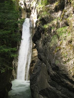 The Tatzelwurm Waterfall features a series of cascades along the Auerbach Stream, dropping 95 meters through a narrow rocky gorge lined with trees.