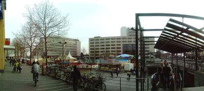 The square connects to multiple public transportation options and provides designated areas for bicycle parking near shops and residential buildings.
