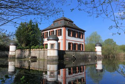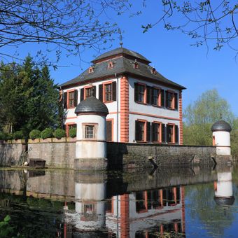 Wasserburg Seligenstadt is a Baroque water castle near the Main River featuring a moat, drawbridge, and four corner towers. The entire structure is surrounded by water that separates it from the surrounding landscape and defines its fortress character.
