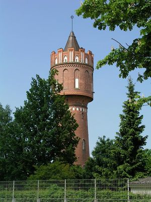 The brick water tower reaches 38 meters high and features a polygonal base with pointed arch windows and green glazed roof tiles.