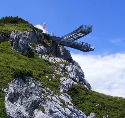 Visitors reach the observation deck by taking the Alpspitzbahn cable car to the mountain station, where the platform extends above the Höllental valley.