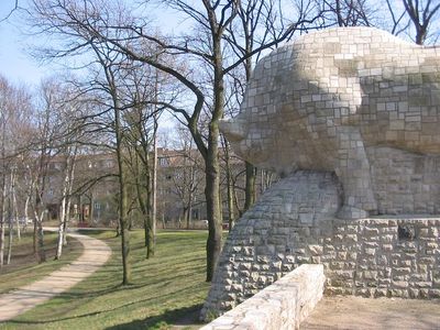 The square contains a massive limestone bull sculpture created by Paul Mersmann between 1934 and 1936, measuring nine meters long and seven meters high.