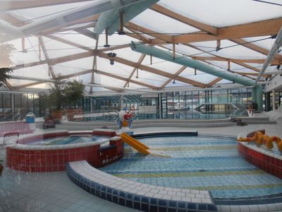 The indoor section features Dresden's longest tube slide at 93 meters, equipped with effect lighting and connecting to a specialized adventure pool.