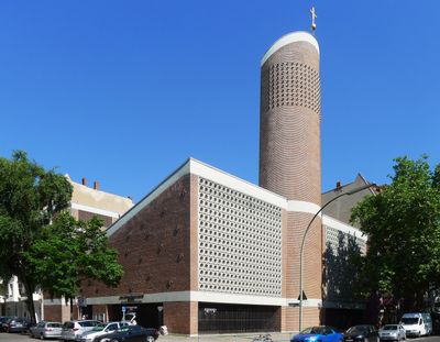 The concrete structure features a 33-meter bell tower and a glass-steel concrete facade facing the Mierendorffplatz square in Berlin.