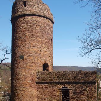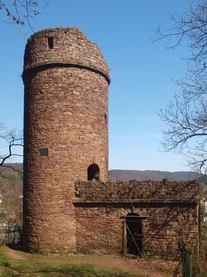 The Hugenottenturm rises from the landscape as a round sandstone structure with an attached building, providing views over the Weser River and surrounding region.