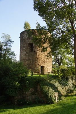 The castle remains include an 11-meter-high round tower and rectangular surrounding walls, situated on the outskirts of Dattenberg village.