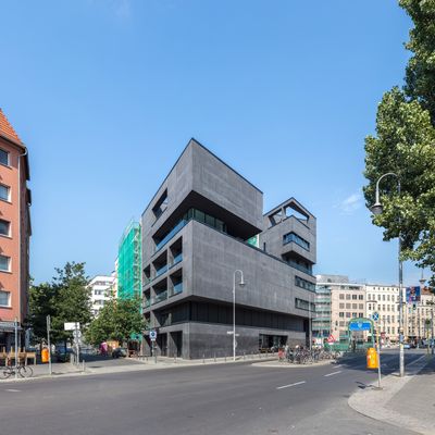 The L40 building presents itself as a sharp-edged black cuboid structure situated on a triangular plot at the intersection of Rosa-Luxemburg-Straße and Linienstraße.