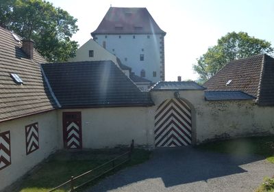 Kemenate Ziegenrück is a rectangular castle structure in Ziegenrück with four stories and walls roughly 1.8 meters thick. Vaulted cellars sit beneath its 17 by 13 meter foundation and connect to surrounding gardens and earthworks that define the site's layout.