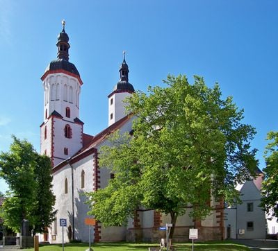 Dom St. Marien zu Wurzen is a gothic cathedral in Saxony featuring two towers on the sides of the main aisle that reach about 42 meters in height. These towers are topped with baroque domes and lanterns, creating the building's distinctive profile above the city.