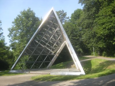 The Gate of Hope is a modern sculpture in Stuttgart made from stainless steel profiles and one-way mirrors arranged in a triangular pyramid shape. The structure rises into the sky and creates varying optical effects through its mirrors depending on the angle from which you view it.