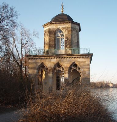The Gothic Library is an octagonal sandstone tower with arcades, a gilded spire, and an external spiral staircase in the New Garden. Its compact design displays typical gothic elements and now serves as an architectural monument.
