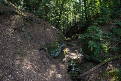 The geological formation developed over centuries as water eroded the Burgsandstein, creating visible layers that document the regional geological history.