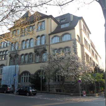 The Siebold-Gymnasium includes a central tower and stands next to the Ringpark, near the Würzburg main train station at Rennweger Ring 11.