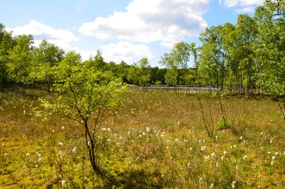 The reserve contains specialized plant species including rosemary heather, bell heather, cranberries, and multiple varieties of cotton grass thriving in acidic conditions.