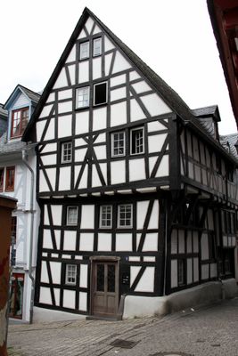 Kleine Rütsche 4 is a timber-framed house in Limburg an der Lahn known as one of the town's narrowest buildings with characteristic wooden beams and details from reconstruction after the great fire. The structure shapes the old town streetscape with its tight facade and belongs to the preserved buildings from this rebuilding period.