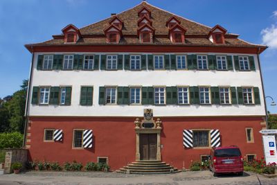 Rotes Schloss Jagsthausen is a manor house with distinctive red stonework and a mansard roof located in Baden-Württemberg. The building sits on the grounds of a former Roman fort and functions today as an event venue and restaurant.