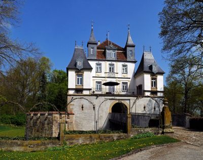 Schloss Eltershofen is a château in Schwäbisch Hall with a rectangular floor plan marked by fortified railings and corner bastions. The property sits within a moated fortified perimeter that provides defensive protection.