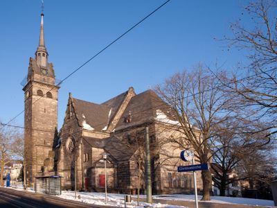 The Christuskirche stands as a neo-Gothic structure with a prominent bell tower, stained glass windows, and detailed architectural elements throughout its exterior.