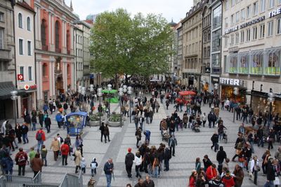 The 400-meter Neuhauser Straße extends from Färbergraben to Karlsplatz, forming a central section of Munich's pedestrian district with numerous retail establishments.