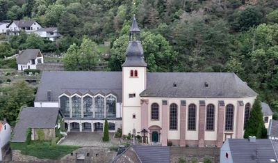 The church bell tower reaches 90 meters in height and contains five bells, each named after different saints, which have rung across Heimbach since 1753.